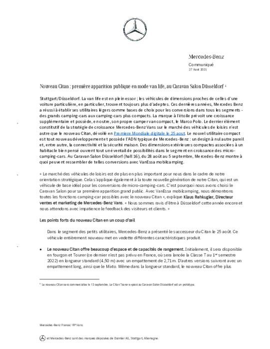 Le dernier élément constitutif de la stratégie de croissance Mercedes-Benz Vans sur le marché des véhicules de loisirs n’est autre que le nouveau Citan, dévoilé en Premiere Mondiale digitale le 25 aout. Le nouvel utilitaire compact est tout nouveau développement et possède l’ADN typique de Mercedes-Benz : un design à nul autre pareil et, entre autre, la connectivité et la sécurité maison...