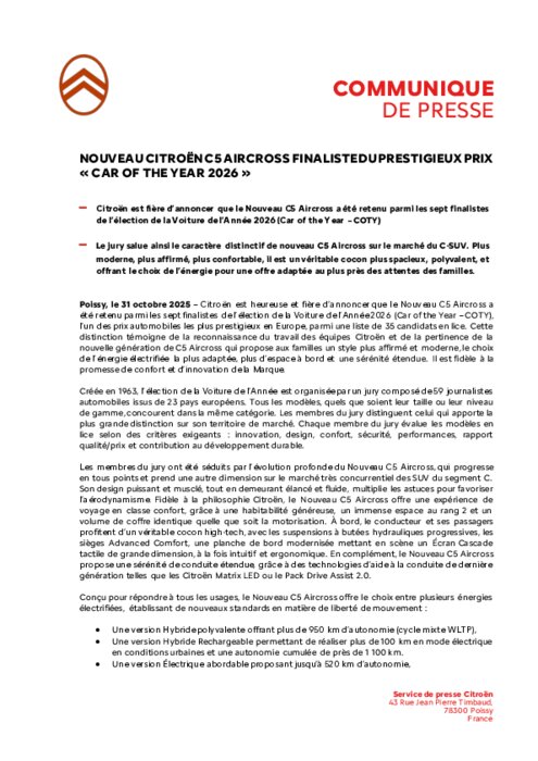 Citroën est heureuse et fière d’annoncer que le Nouveau C5 Aircross a été retenu parmi les sept finalistes de l’élection de la Voiture de l’Année 2026 (Car of the Year – COTY), l’un des prix automobiles les plus prestigieux en Europe, parmi une liste de 35 candidats en lice. Cette distinction témoigne de la reconnaissance du travail des équipes Citroën et de la pertinence de la nouvelle génération de C5 Aircross qui propose aux familles un style plus affirmé et moderne, le choix de l’énergie électrifiée la plus adaptée, plus d’espace à bord et une sérénité étendue. Il est fidèle à la promesse de confort et d’innovation de la Marque.