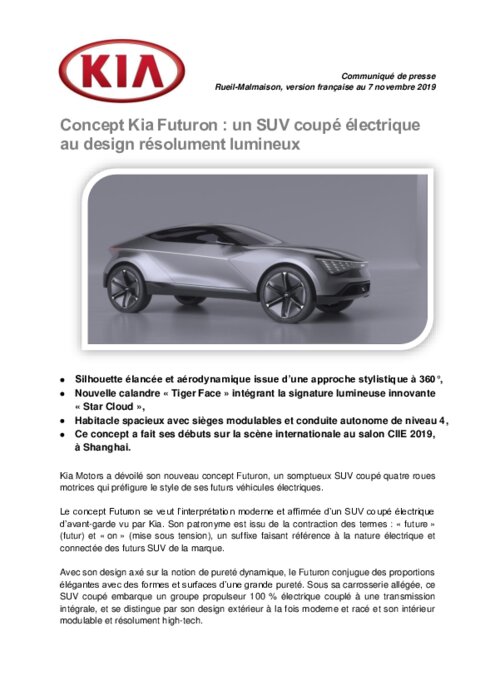 Kia Motors a dévoilé son nouveau concept Futuron, un somptueux SUV coupé quatre roues motrices qui préfigure le style de ses futurs véhicules électriques. Le concept Futuron se veut l’interprétation moderne et affirmée d’un SUV coupé électrique d’avant-garde vu par Kia. Son patronyme est issu de la contraction des termes : " future " (futur) et " on " (mise sous tension), un suffixe faisant référence à la nature électrique et connectée des futurs SUV de la marque.