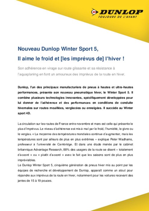 Dunlop, l'un des principaux manufacturiers de pneus à hautes et ultra-hautes performances, présente son nouveau pneumatique hiver, le Winter Sport 5. Il combine plusieurs technologies innovantes, spécifiquement développées pour lui donner de l’adhérence et des performances en conditions de conduite hivernales sur routes mouillées, verglacées ou enneigées. Il succède au Winter sport 4D.