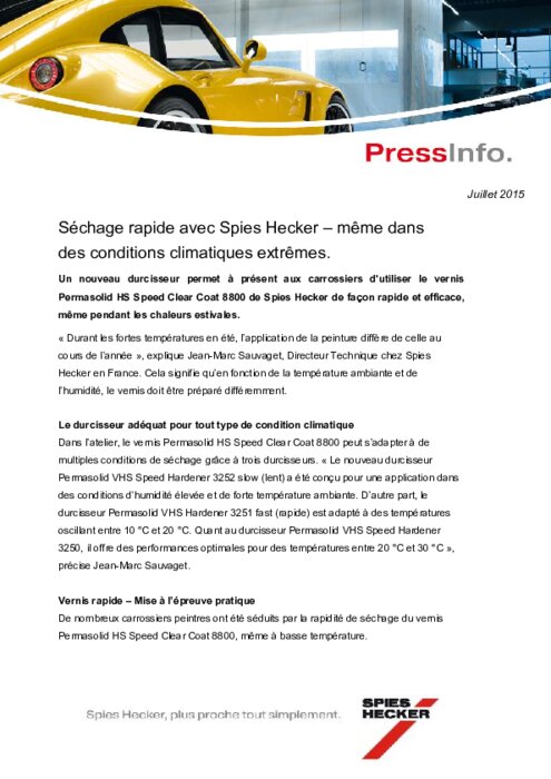 Equipementiers 24 juillet 2015 - 17:31 Un nouveau durcisseur permet à présent aux carrossiers d'utiliser le vernis Permasolid HS Speed Clear Coat 8800 de Spies Hecker de façon rapide et efficace, même pendant les chaleurs estivales. PDF (120 Ko) Télécharger