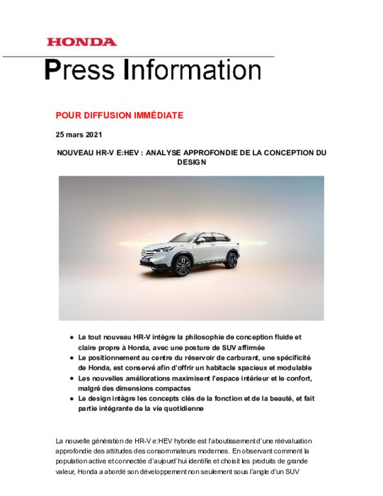La nouvelle génération de HR-V e:HEV hybride est l’aboutissement d’une réévaluation approfondie des attitudes des consommateurs modernes. En observant comment la population active et connectée d’aujourd’hui identifie et choisit les produits de grande valeur, Honda a abordé son développement non seulement sous l’angle d’un SUV compact entièrement nouveau, mais aussi celui d’un produit de consommation dont la capacité de séduction repose sur la désirabilité, la fonctionnalité et la convivialité.