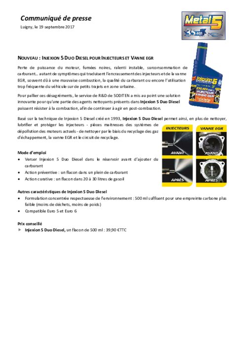 Basé sur la technique de Injexion 5 Diesel créé en 1993, Injexion 5 Duo Diesel permet ainsi, en plus de nettoyer, lubrifier et protéger les injecteurs - pièces maîtresses des systèmes de dépollution des moteurs actuels - de nettoyer par le biais du recyclage des gaz d’échappement, la vanne EGR et le circuit de recyclage.