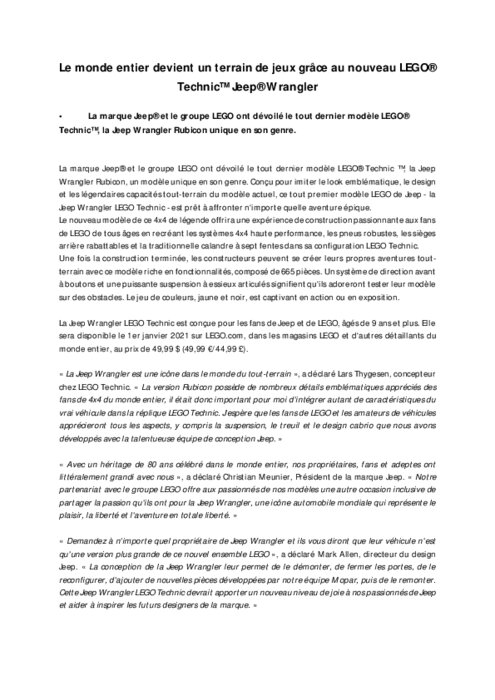 La marque Jeep et le groupe LEGO ont dévoilé le tout dernier modèle LEGO Technic, la Jeep Wrangler Rubicon, un modèle unique en son genre. Conçu pour imiter le look emblématique, le design et les légendaires capacités tout-terrain du modèle actuel, ce tout premier modèle LEGO de Jeep - la Jeep Wrangler LEGO Technic - est prêt à affronter n'importe quelle aventure épique.