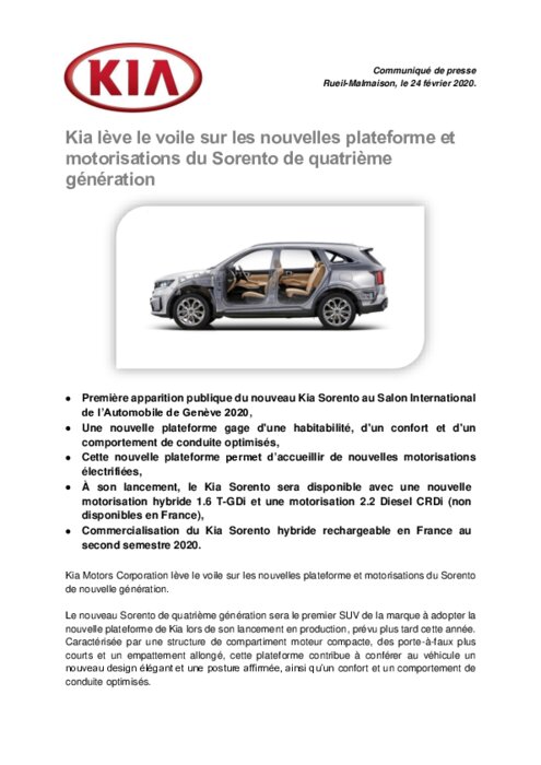 Kia Motors Corporation lève le voile sur les nouvelles plateforme et motorisations du Sorento de nouvelle génération. Le nouveau Sorento de quatrième génération sera le premier SUV de la marque à adopter la nouvelle plateforme de Kia lors de son lancement en production, prévu plus tard cette année. Caractérisée par une structure de compartiment moteur compacte, des porte-à-faux plus courts et un empattement allongé, cette plateforme contribue à conférer au véhicule un nouveau design élégant...