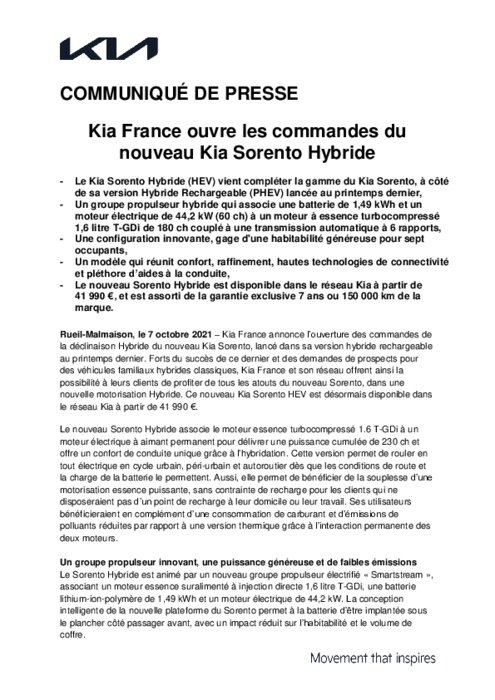 Kia France annonce l’ouverture des commandes de la déclinaison Hybride du nouveau Kia Sorento, lancé dans sa version hybride rechargeable au printemps dernier. Forts du succès de ce dernier et des demandes de prospects pour des véhicules familiaux hybrides classiques, Kia France et son réseau offrent ainsi la possibilité à leurs clients de profiter de tous les atouts du nouveau Sorento, dans une nouvelle motorisation Hybride. Ce nouveau Kia Sorento HEV est disponible dans le réseau Kia...