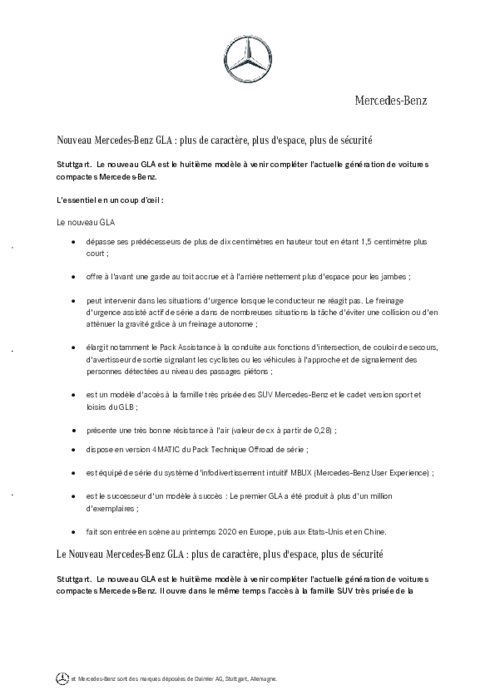 Le nouveau GLA est le huitième modèle à venir compléter l'actuelle génération de voitures compactes Mercedes-Benz. Il ouvre dans le même temps l'accès à la famille SUV très prisée de la marque et offre encore plus de caractère que son prédécesseur : Avec ses 1 611 millimètres (1 616 avec les rampes de toit), le nouveau GLA dépasse de plus de dix centimètres son prédécesseur. La position d'assise surélevée typique des SUV garantit une meilleure garde au toit sur la première rangée.
