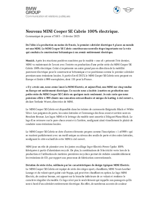 De l'idée à la production en moins de 8 mois, le premier cabriolet électrique 4 places au monde est une MINI. Le MINI Cooper SE Cabrio constitue une nouvelle étape importante sur la voie qui conduira le constructeur britannique à un avenir entièrement électrique.