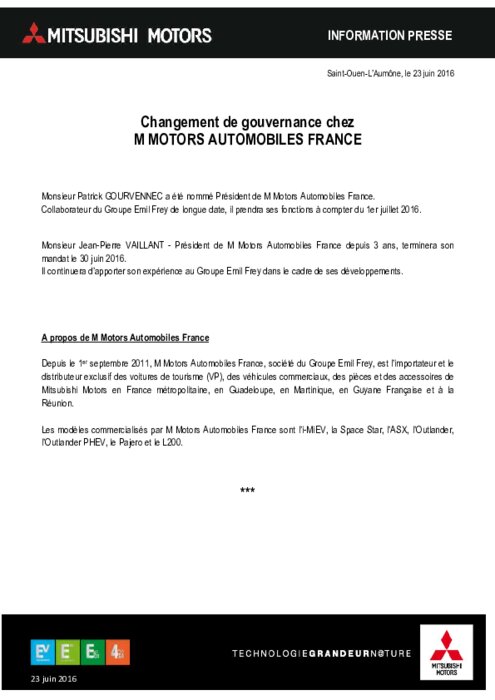Constructeurs 23 juin 2016 - 17:47 Monsieur Patrick GOURVENNEC a été nommé Président de M Motors Automobiles France. Collaborateur du Groupe Emil Frey de longue date, il prendra ses fonctions à compter du 1er juillet 2016. PDF (91 Ko) Télécharger