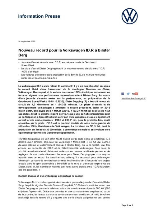 La Volkswagen ID.R est de retour. Et comment ! Il y a un peu plus d'un an après le record établi dans l’ascension de la montagne Tianmen en Chine, Volkswagen Motorsport et la voiture de course 100% électrique reviennent en force et signent une performance impressionnante à Bilster Berg. Au cours d'une journée d'essais axées sur la performance, en préparation de la Goodwood SpeedWeek (16-18.10.2020), Dieter Depping (A) a bouclé le tour du circuit de 4,2 kilomètres en 1 :24,206 minutes...