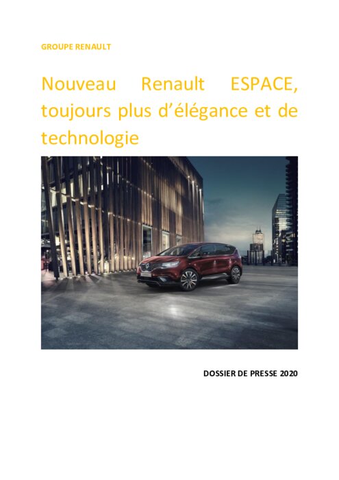 Constructeurs 25 novembre 2019 - 14:53 Vendu à plus de 1,3 million d’exemplaires depuis 1984, Renault Espace est un véhicule iconique qui n’a cessé de se réinventer. Sa cinquième génération a été réinterprétée et s’est imposée comme un crossover statutaire, au design affirmé. PDF (808 Ko) Télécharger