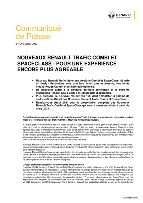 Nouveau Renault Trafic, dans ses versions Combi et SpaceClass, dévoile un design dynamique avec une face avant plus expressive, une teinte inédite Rouge Carmin et un habitacle optimisé. De nouvelles aides à la conduite dernière génération et le système multimédia Renault EASY LINK sont désormais disponibles. Plus puissant, le nouveau moteur dCi 150 vient compléter la gamme de motorisations Diesel des Nouveaux Renault Trafic Combi et SpaceClass...