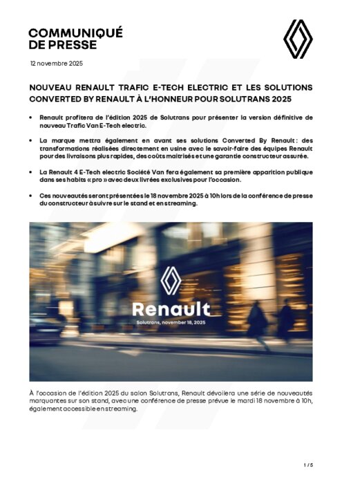 Premier modèle de la nouvelle génération d’utilitaires 100 % électriques à arriver sur nos routes, nouveau Renault Trafic Van E-Tech electric sera présenté dans sa version de série sur le stand de Renault à Solutrans avant d’arriver sur les routes fin 2026.