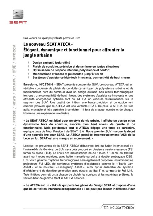SEAT présente son premier SUV. Le nouveau ATECA est un véritable condensé de plaisir de conduite dynamique, de polyvalence urbaine et de fonctionnalités hors du commun avec un design exclusif. Ses atouts technologiques tels que : une connectivité de haut niveau, des systèmes d'assistance innovants et une efficacité énergétique optimale font du ATECA un véhicule révolutionnaire sur le segment des SUV.