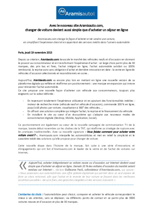 Aujourd’hui, Aramisauto.com va encore plus loin en mettant en ligne une nouvelle version de sa plateforme digitale qui reflète et réaffirme son positionnement : une marque en expansion qui innove pour réinventer l’achat automobile. Ce site propose une nouvelle façon d’acheter son véhicule aux consommateurs, toujours plus exigeants sur la valeur délivrée.