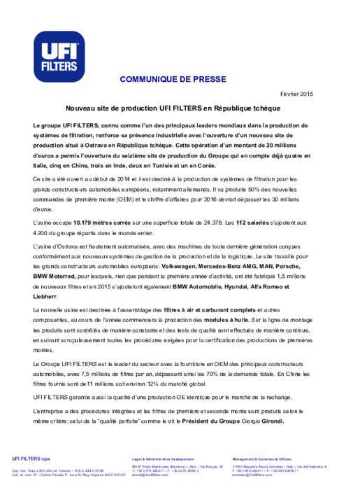 Le groupe UFI FILTERS, connu comme l’un des principaux leaders mondiaux dans la production de systèmes de filtration, renforce sa présence industrielle avec l’ouverture d’un nouveau site de production situé à Ostrava en République tchèque. Cette opération d’un montant de 20 millions d’euros a permis l’ouverture du seizième site de production du Groupe qui en compte déjà quatre en Italie, cinq en Chine, trois en Inde, deux en Tunisie et un en Corée.