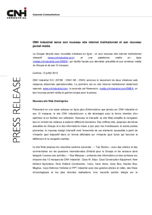 Le Groupe dévoile deux nouvelles initiatives en ligne : un tout nouveau site internet institutionnel interactif (www.cnhindustrial.com), et une plateforme média en ligne (media.cnhindustrial.com/EMEA), qui facilite l'accès aux dernières actualités et aux contenus média du Groupe et de ses 12 marques.