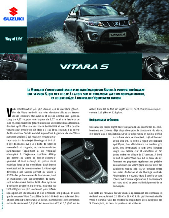Constructeurs 07 juillet 2016 - 14:07 Le Vitara est l’un des modèles les plus emblématiques de Suzuki. Il propose dorénavant une version S, qui met le cap à la fois sur le dynamisme avec un nouveau moteur, et le luxe grâce à un niveau d’équipement enrichi. PDF (1 Mo) Télécharger