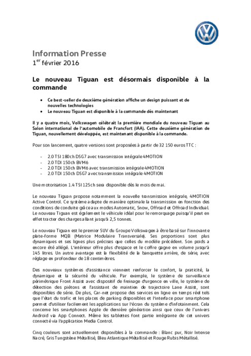 Il y a quatre mois, Volkswagen célébrait la première mondiale du nouveau Tiguan au Salon international de l'automobile de Francfort (IAA). Cette deuxième génération de Tiguan, nouvellement développée, est maintenant disponible à la commande.