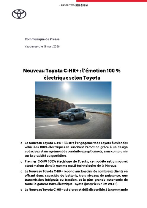 Le Nouveau Toyota C-HR+ perpétue l’héritage de l’iconique Toyota C-HR vendu à plus d’un million d’exemplaires en Europe en deux générations. Il bénéficie de l’ADN des modèles 100% électriques Toyota combinant des motorisations efficientes et des performances de premier plan, un design élégant, et toute la qualité, la durabilité et la fiabilité qui font la réputation de la Marque.