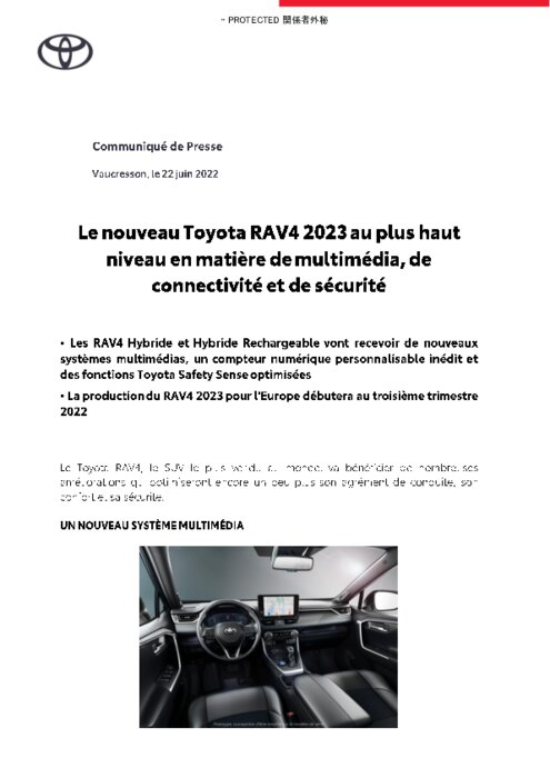 Les RAV4 Hybride et Hybride Rechargeable vont recevoir de nouveaux systèmes multimédias, un compteur numérique personnalisable inédit et des fonctions Toyota Safety Sense optimisées. La production du RAV4 2023 pour l'Europe débutera au troisième trimestre 2022. Le Toyota RAV4, le SUV le plus vendu au monde, va bénéficier de nombreuses améliorations qui optimiseront encore un peu plus son agrément de conduite, son confort et sa sécurité.