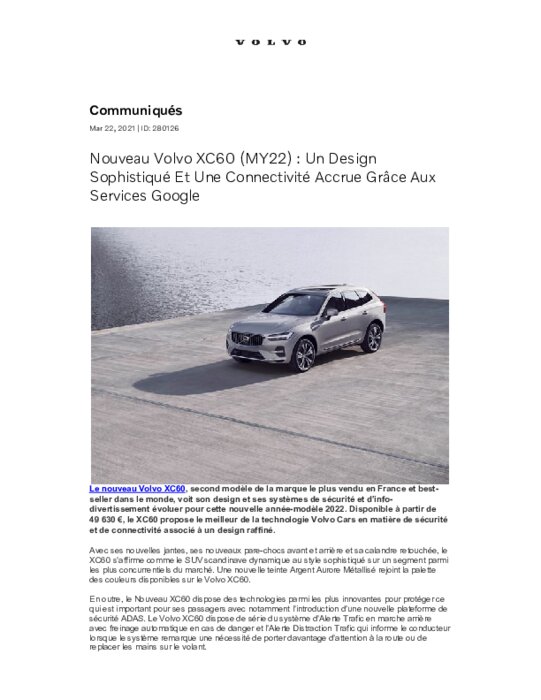 Le nouveau Volvo XC60, second modèle de la marque le plus vendu en France et best-seller dans le monde, voit son design et ses systèmes de sécurité et d’info-divertissement évoluer pour cette nouvelle année-modèle 2022. Disponible à partir de 49 630 €, le XC60 propose le meilleur de la technologie Volvo Cars en matière de sécurité et de connectivité associé à un design raffiné.