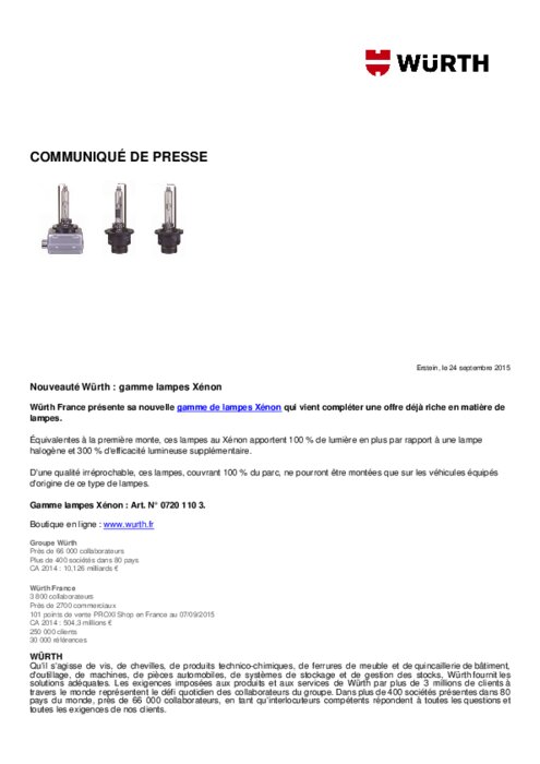 Würth France présente sa nouvelle gamme de lampes Xénon qui vient compléter une offre déjà riche en matière de lampes.Équivalentes à la première monte, ces lampes au Xénon apportent 100 % de lumière en plus par rapport à une lampe halogène et 300 % d'efficacité lumineuse supplémentaire. D'une qualité irréprochable, ces lampes, couvrant 100 % du parc, ne pourront être montées que sur les véhicules équipés d'origine de ce type de lampes.