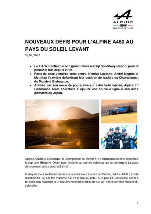 Après l’Amérique et l’Europe, le Championnat du Monde FIA d’Endurance oriente désormais le cap vers l’Extrême-Orient pour entamer sa tournée asiatique qui se prolongera jusqu’au dénouement de la saison à Bahreïn. Quelques jours seulement après son succès aux 6 Heures de Monza, l’Alpine A480 a pris la direction de Fuji par fret maritime. Ce n’est qu’aujourd’hui qu’Alpine Elf Endurance Team a retrouvé son Hypercar pour peaufiner ses préparatifs en vue de l’avant-dernière manche du calendrier.
