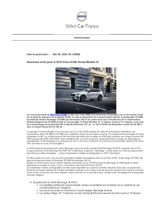 Les nouveaux tarifs du SUV Volvo XC60 en date du 2 mars 2020 sont désormais disponibles sur le site média. Parmi les évolutions majeures de la gamme XC60, on note la disparition de la motorisation hybride rechargeable T8 AWD au profit du moteur Recharge T6 AWD qui développe 340 ch au cumul ainsi que l’introduction de la motorisation Polestar Engineered T8 AWD de 405 ch...