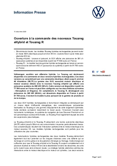 Volkswagen accélère son offensive hybride. Le Touareg est dorénavant disponible à la commande en deux versions hybrides rechargeables. Ces deux versions se caractérisent par une autonomie électrique allant jusqu'à environ 49 kilomètres (WLTP). La gamme des SUV associant moteur électrique et moteur essence débute avec le nouveau Touareg eHybrid qui affiche une puissance système de 280 kW (381ch)...