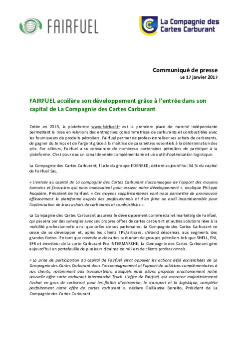 Créée en 2015, la plateforme www.fairfuel.fr est la première place de marché indépendante permettant la mise en relations des entreprises consommatrices de carburants et combustibles avec les fournisseurs de produits pétroliers. Fairfuel permet de professionnaliser ses achats de carburants, de gagner du temps et de l’argent grâce à la maîtrise de paramètres essentiels à la détermination des prix.