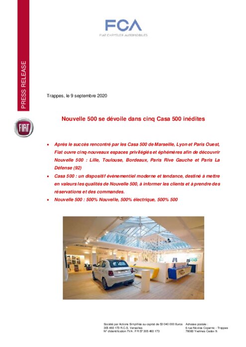 Après avoir lancé avec succès ses premières Casa 500 en juillet dernier à Marseille, Lyon et au Chesnay en région parisienne (voir communiqué), Fiat poursuit le déploiement de son programme de présentation en avant-première de Nouvelle 500, désormais 500% électrique. La marque italienne lance ainsi l’ouverture de cinq nouveaux sites situés à Lille, Toulouse, Bordeaux, Paris La Défense et Paris Rive Gauche (VIIème arrondissement).