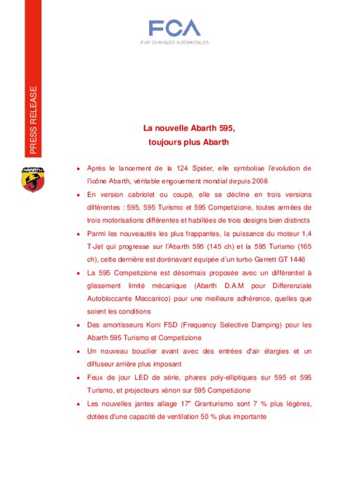 A peine plus de deux mois se sont écoulés depuis le lancement de l'Abarth 124 Spider et la marque au Scorpion est de nouveau sous les feux des projecteurs. La nouvelle Abarth 595 est la continuité de son aînée devenue icône : des moteurs plus puissants, un équipement de série plus important et un éventail de nouvelles solutions, certaines d'entre elles habituellement réservées aux voitures de segments supérieurs.