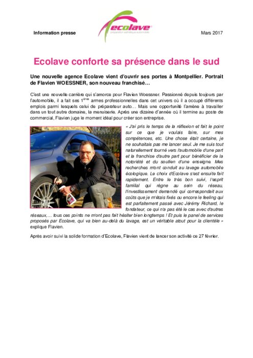 Une nouvelle agence Ecolave vient d’ouvrir ses portes à Montpellier. Portrait de Flavien WOESSNER, son nouveau franchisé… C’est une nouvelle carrière qui s’amorce pour Flavien Woessner. Passionné depuis toujours par l’automobile, il a fait ses 1ères armes professionnelles dans cet univers où il a occupé différents emplois parmi lesquels celui de préparateur auto…