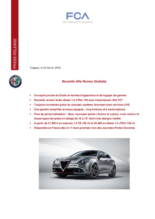 Pour continuer à jouer un rôle important dans le se gment, l’Alfa Romeo Giulietta évolue grâce à un caractère esthétique désormais plus sportif, de nouveaux éléments spécifiques et un esprit de famille partagé avec le fascinante Giulia, nouveau paradigme de la marque et expression ultime du concept de la mécanique des émotions (la Meccanica delle Emozioni).