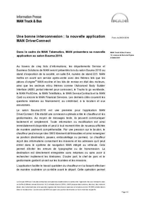 Le salon Bauma 2016 est une première pour l’application MAN DriverConnect. Elle établit une connexion optimale entre le chauffeur et les gestionnaires. Au moyen de messages texte, ils peuvent communiquer facilement et simplement. Toute information ou modification est ainsi immédiatement disponible et peut à tout moment être de nouveau affichée de manière aisément compréhensible. Le chauffeur peut envoyer des SMS librement définissables et ainsi renseigner sa position.