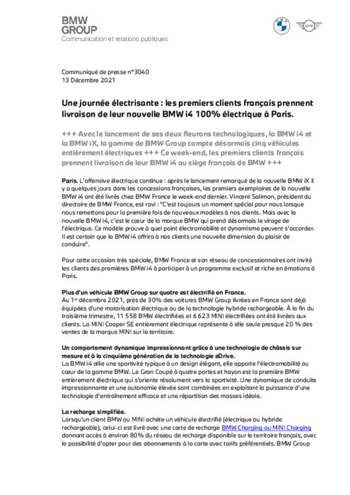 L’offensive électrique continue : après le lancement remarqué de la nouvelle BMW iX il y a quelques jours dans les concessions françaises, les premiers exemplaires de la nouvelle BMW i4 ont été livrés chez BMW France le week-end dernier. Vincent Salimon, président du directoire de BMW France, est ravi : "C'est toujours un moment spécial pour nous lorsque nous remettons pour la première fois de nouveaux modèles à nos clients...