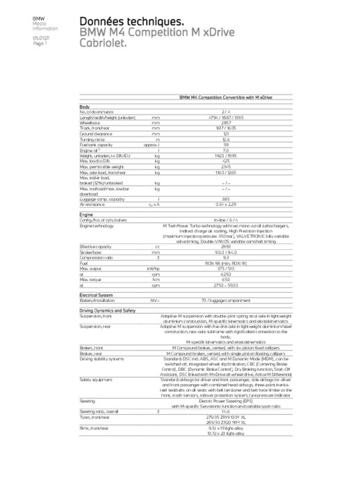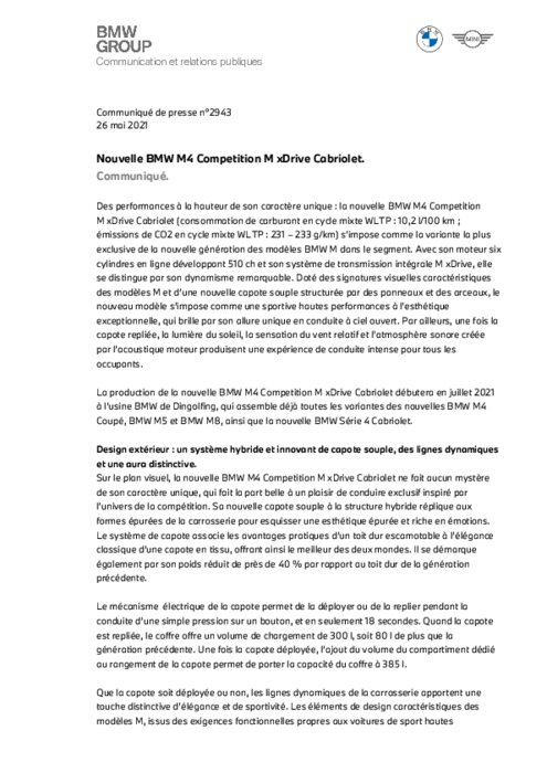 Des performances à la hauteur de son caractère unique : la nouvelle BMW M4 Compétition M xDrive Cabriolet (consommation de carburant en cycle mixte WLTP : 10,2 l/100 km ; émissions de CO2 en cycle mixte WLTP : 231 - 233 g/km) s'impose comme la variante la plus exclusive de la nouvelle génération des modèles BMW M dans le segment. Avec son moteur six cylindres en ligne développant 510 ch et son système de transmission intégrale M xDrive, elle se distingue par son dynamisme remarquable...