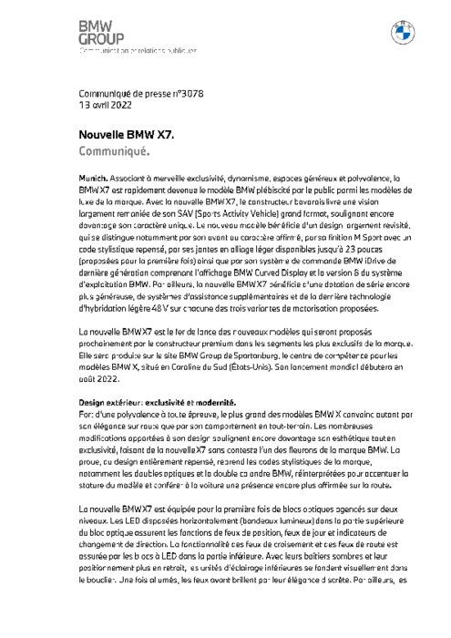 Constructeurs 13 avril 2022 - 00:12 Associant à merveille exclusivité, dynamisme, espaces généreux et polyvalence, la BMW X7 est rapidement devenue le modèle BMW plébiscité par le public parmi les modèles de luxe de la marque. PDF (1 Mo) Télécharger