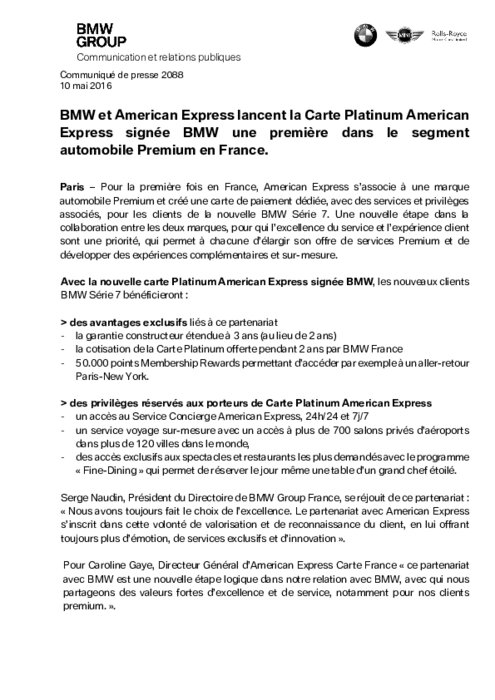 Pour la première fois en France, American Express s’associe à une marque automobile Premium et créé une carte de paiement dédiée, avec des services et privilèges associés, pour les clients de la nouvelle BMW Série 7. Une nouvelle étape dans la collaboration entre les deux marques, pour qui l’excellence du service et l’expérience client sont une priorité, qui permet à chacune d’élargir son offre de services Premium et de développer des expériences complémentaires et sur-mesure.