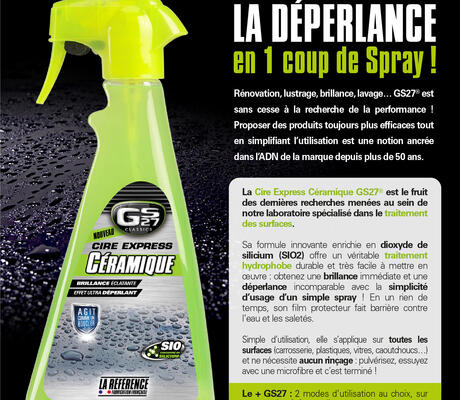 GS27 est sans cesse à la recherche de la performance ! Proposer des produits toujours plus efficaces tout en simplifiant l'utilisation est une notion ancrée dans l'ADN de la marque depuis plus de 50 ans. La Cire Express Céramique est le fruit des dernières recherches menées au sein du laboratoire GS27 : sa formule innovante enrichie en dioxyde de silicium (SIO2) offre à la fois une brillance instantanée mais également une déperlance incomparable, le tout avec la simplicité d'usage d'un spray.