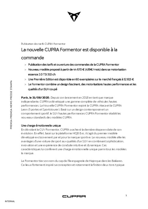 Depuis son lancement en 2018 en tant que marque indépendante, CUPRA a développé une gamme complète de véhicules hautes performances. La Nouvelle CUPRA Formentor rejoint la CUPRA Ateca et la CUPRA Leon (5 portes et Sportstourer). Basé sur un design contemporain et un comportement sportif, le SUV hautes performances CUPRA Formentor établit les nouveaux standards des modèles CUPRA.