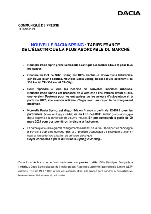 Dacia bouscule le monde de l’automobile avec son premier modèle 100% électrique. Compacte à l’extérieur, Dacia Spring dispose de 4 vraies places. Avec une autonomie rassurante de 230 km WLTP combiné (305 km WLTP City) et ses équipements utiles, elle répond sans superflu à l’essentiel des besoins de mobilité urbaine et périurbaine.