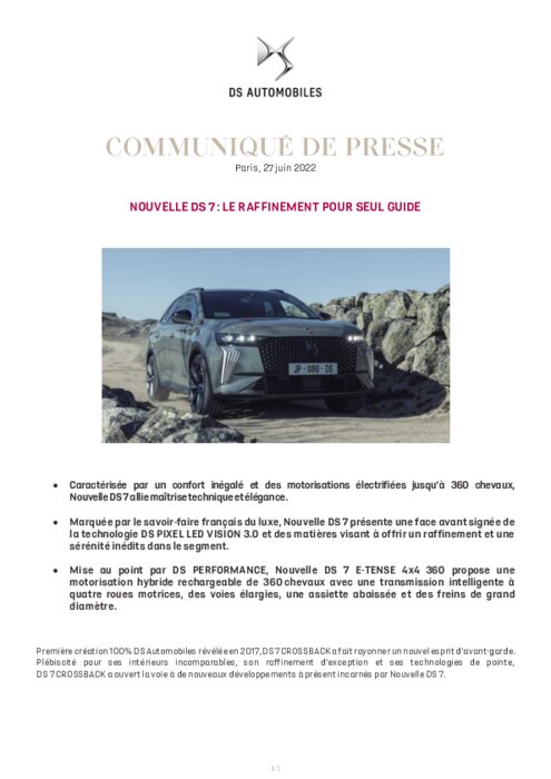 Première création 100 % DS Automobiles révélée en 2017, DS 7 CROSSBACK a fait rayonner un nouvel esprit d’avant-garde. Plébiscité pour ses intérieurs incomparables, son raffinement d’exception et ses technologies de pointe, DS 7 CROSSBACK a ouvert la voie à de nouveaux développements à présent incarnés par Nouvelle DS 7.