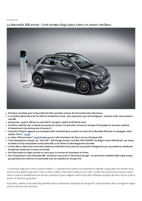 A Milan, la Nouvelle 500, première voiture entièrement électrique du Groupe FCA, a été présentée. Elle va changer les règles pour les véhicules zéro émission. Pour imaginer l'avenir de la 500, la marque Fiat est partie de ce qui en a fait ce qu'elle est. La première génération offrait mobilité et liberté dans les années 1960. La 500 était un véritable phénomène, devenant au fil du temps une marque à elle seule, extrêmement appréciée...