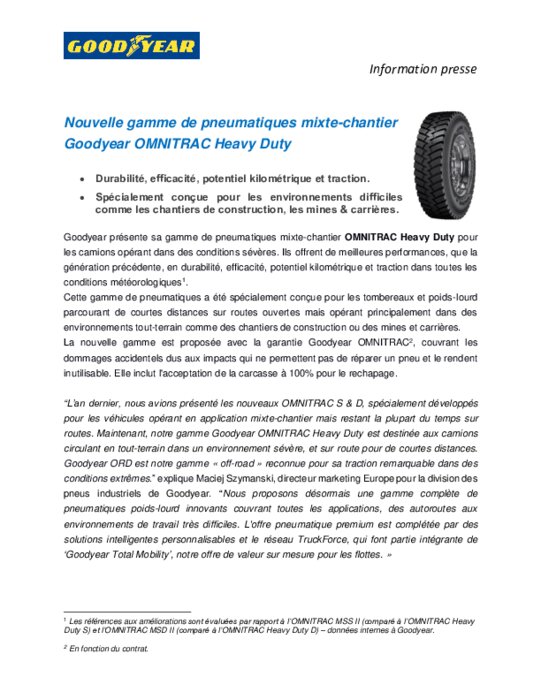 Goodyear présente sa gamme de pneumatiques mixte-chantier OMNITRAC Heavy Duty pour les camions opérant dans des conditions sévères. Ils offrent de meilleures performances, que la génération précédente, en durabilité, efficacité, potentiel kilométrique et traction dans toutes les conditions météorologiques1.