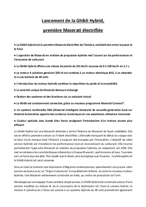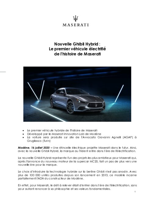 Une étincelle électrique projette Maserati dans le futur. Ainsi, avec la nouvelle Ghibli Hybrid, la marque au Trident entre dans l’ère de l'électrification. La nouvelle Ghibli Hybrid représente l'un des projets les plus ambitieux pour Maserati qui, après l'annonce du nouveau moteur de la supercar MC20, fait un pas de plus vers une nouvelle ère pour la marque.