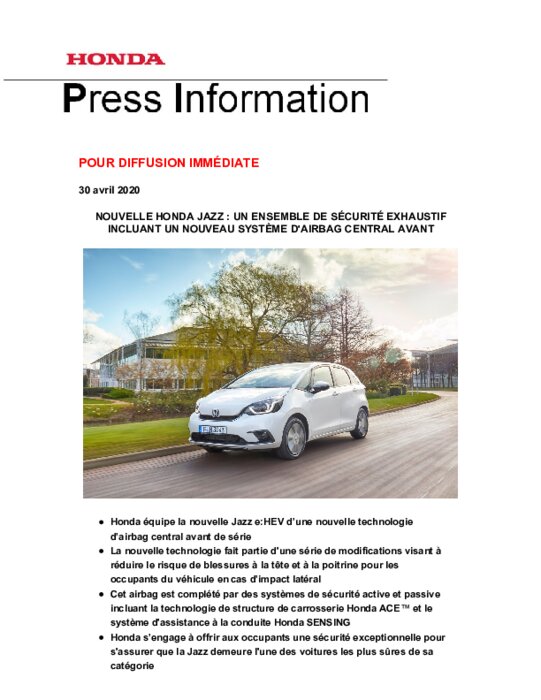 Illustration de l’engagement de Honda pour la sécurité des occupants, la nouvelle Honda Jazz est le premier modèle de la marque en Europe, et le premier modèle de sa catégorie sur le marché, équipé de série de la nouvelle technologie d'airbag central avant. Cette fonctionnalité exclusive de sécurité passive n’est que l’un des éléments de l’ensemble exhaustif de systèmes de sécurité et d'assistance à la conduite de la nouvelle Jazz...