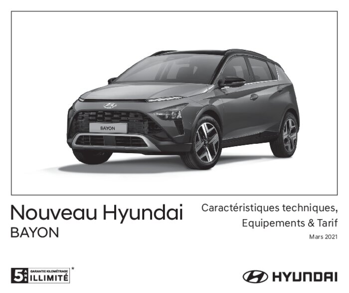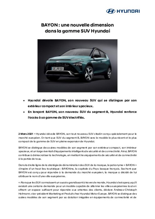 En tant que SUV du segment B, BAYON sera le modèle le plus récent et le plus compact de la gamme de SUV en pleine expansion de Hyundai. BAYON se distingue des autres modèles de son segment par son extérieur compact, son intérieur spacieux, et un large éventail d’équipements intelligents de sécurité et de connectivité. Ainsi, BAYON contribue à démocratiser la technologie, en mettant les équipements de sécurité et de connectivité à la portée de tous.