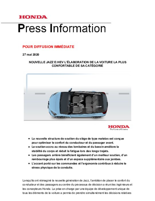 Lorsqu’ils ont réimaginé la nouvelle génération de Jazz, l’ambition de placer le confort du conducteur et des passagers au centre du processus de décision a réuni les ingénieurs et les concepteurs Honda. La prise en charge par une équipe de développement unique de tous les éléments de la voiture a permis de prendre simultanément les décisions relatives à la structure, à la conception et à l’ergonomie, et ainsi d’élaborer des niveaux de confort et d’habitabilité de premier ordre...